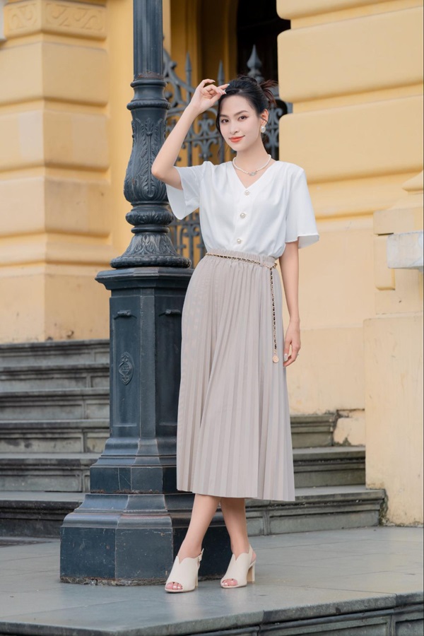 Không dừng lại ở đó, bạn còn có thể phối hợp thêm một số phụ kiện như vòng cổ, hoa tai, đồng hồ để tăng thêm sự thanh lịch và hoàn thiện bộ trang phục.