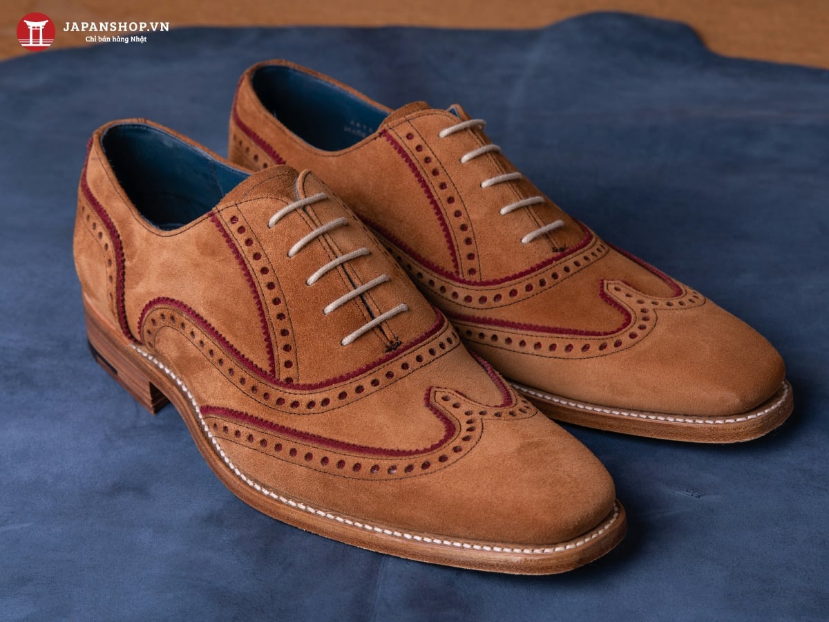 - Wingtip Oxford (Brogue): Đặc trưng bởi lớp da ở mũi giày được cắt theo hình chữ "W" (như cánh chim) và thường được trang trí bằng các lỗ đục (Brogueing). Wingtip mang phong cách hơi hướng nghệ thuật, phóng khoáng và ít trang trọng hơn hai loại trên, rất hợp để diện cùng quần jeans hoặc chinos.