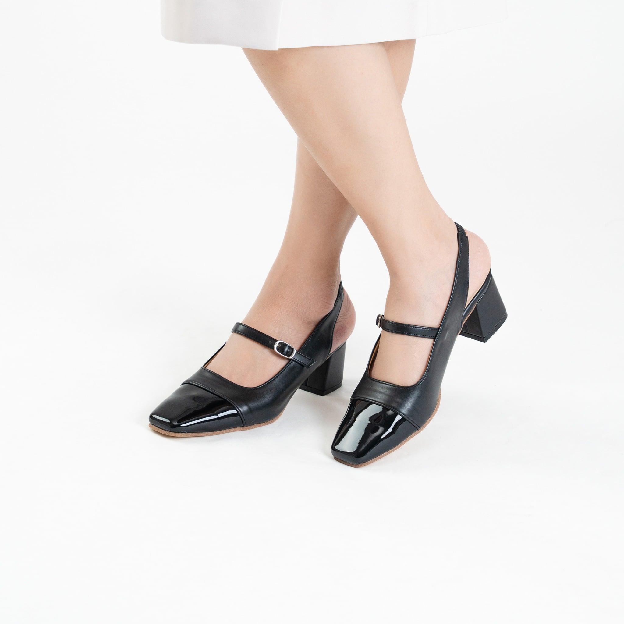 - Kiểu dáng: Gót vuông, kết hợp dáng giày Mary Jane và Slingback