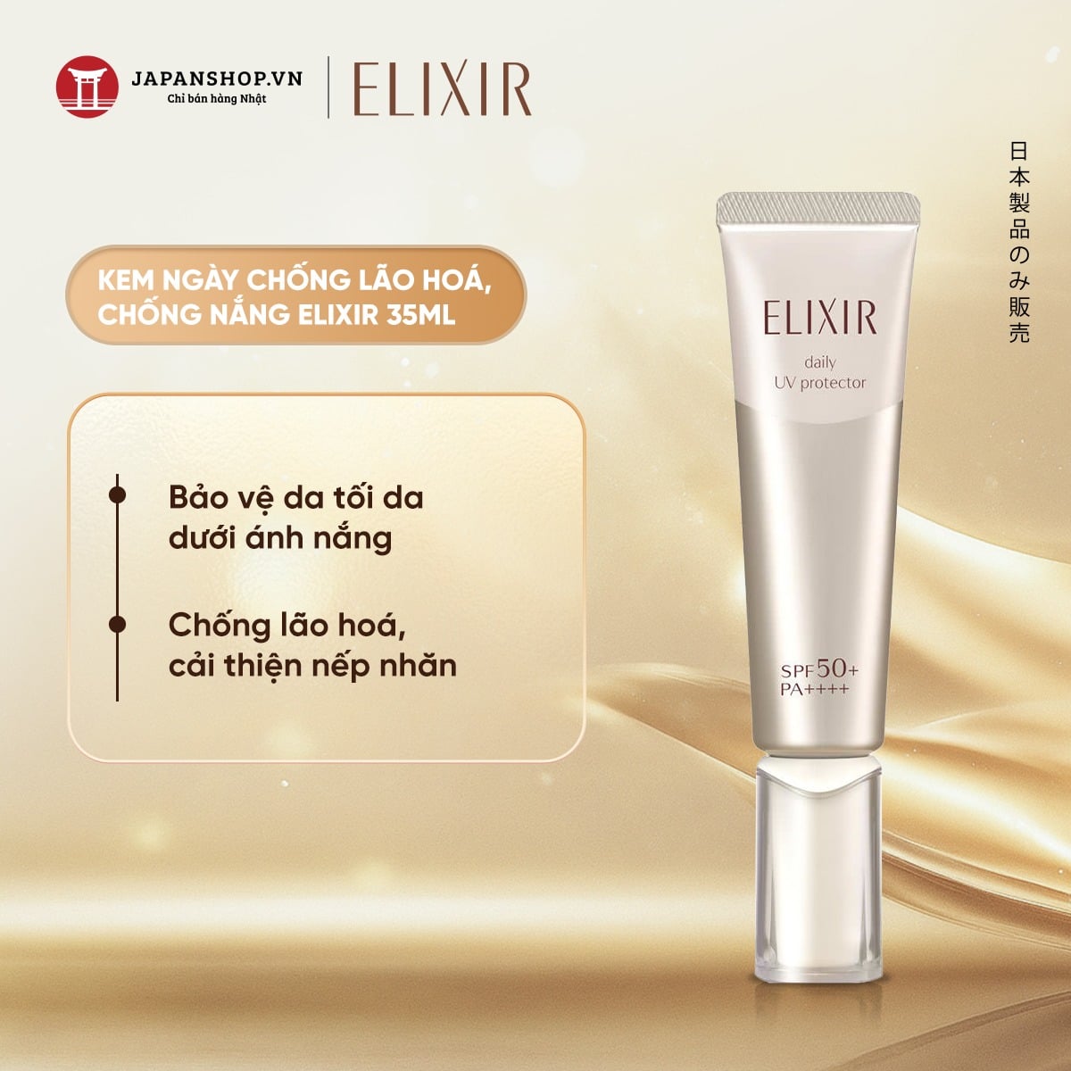 Kem ngày chống lão hoá, chống nắng Elixir 35ml là một sản phẩm đa năng dành cho buổi sáng, tích hợp 3 công dụng chính trong 1: sữa dưỡng ẩm, kem chống nắng bảo vệ mạnh mẽ, và lớp lót trang điểm. Sản phẩm được thiết kế để giải quyết các dấu hiệu lão hóa sớm, đồng thời bảo vệ da toàn diện khỏi tác hại của tia UV và các yếu tố môi trường. Với công thức đặc biệt chứa các thành phần chống lão hóa tiên tiến như collagen và elastin, cùng các dưỡng chất khác, sản phẩm giúp duy trì độ săn chắc, đàn hồi và vẻ căng bóng tự nhiên (Tsuyadama) cho làn da, mang lại cảm giác ẩm mượt, tươi trẻ và rạng rỡ suốt cả ngày dài.