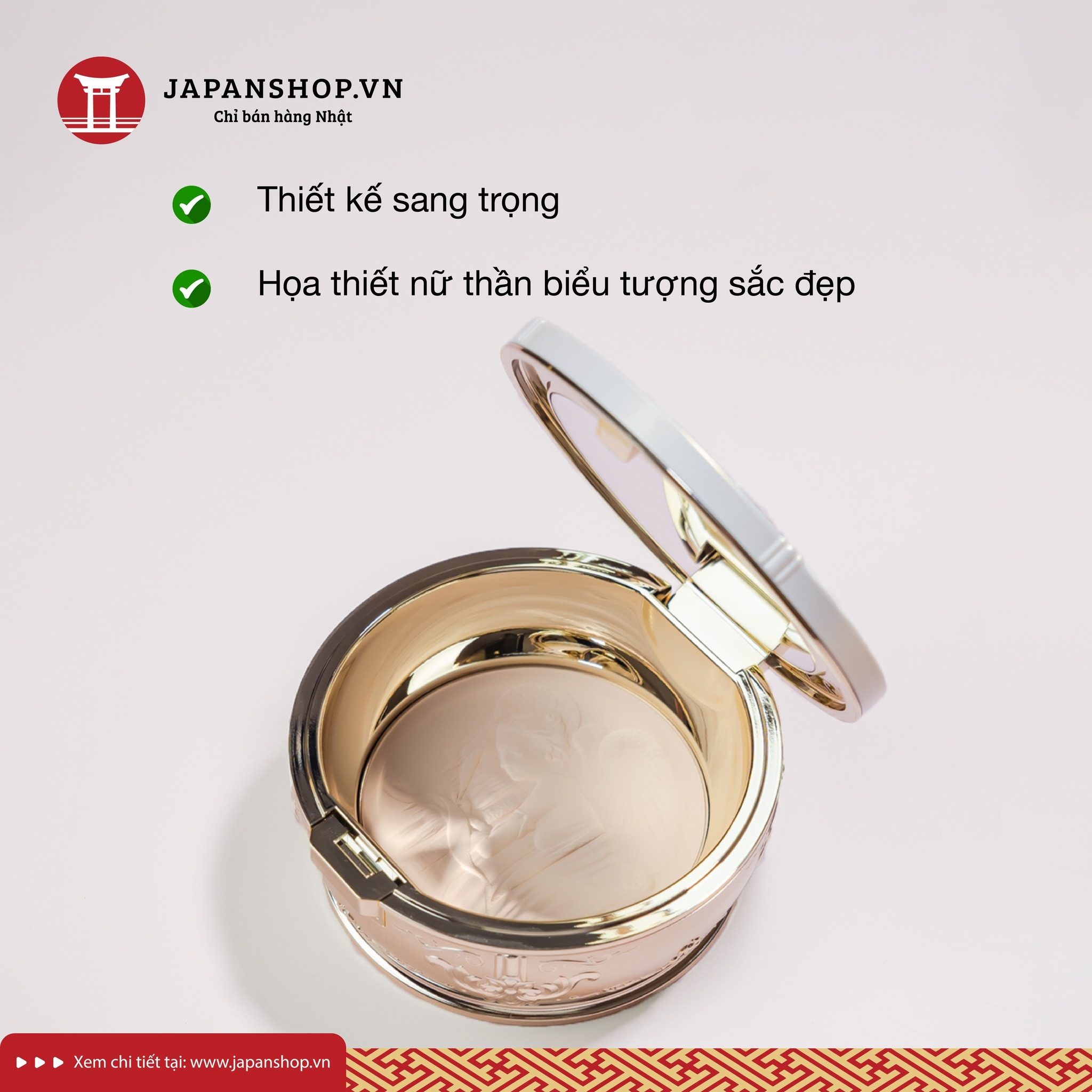 Hộp phấn 24g (nhiều gấp đôi, gấp 3 các dòng cao cấp khác), kèm bông phấn được thiết kế tinh tế, mịn màng, bông xù cao cấp, mềm mịn, được làm từ chất liệu vải nhung, dễ tán và dễ dùng.