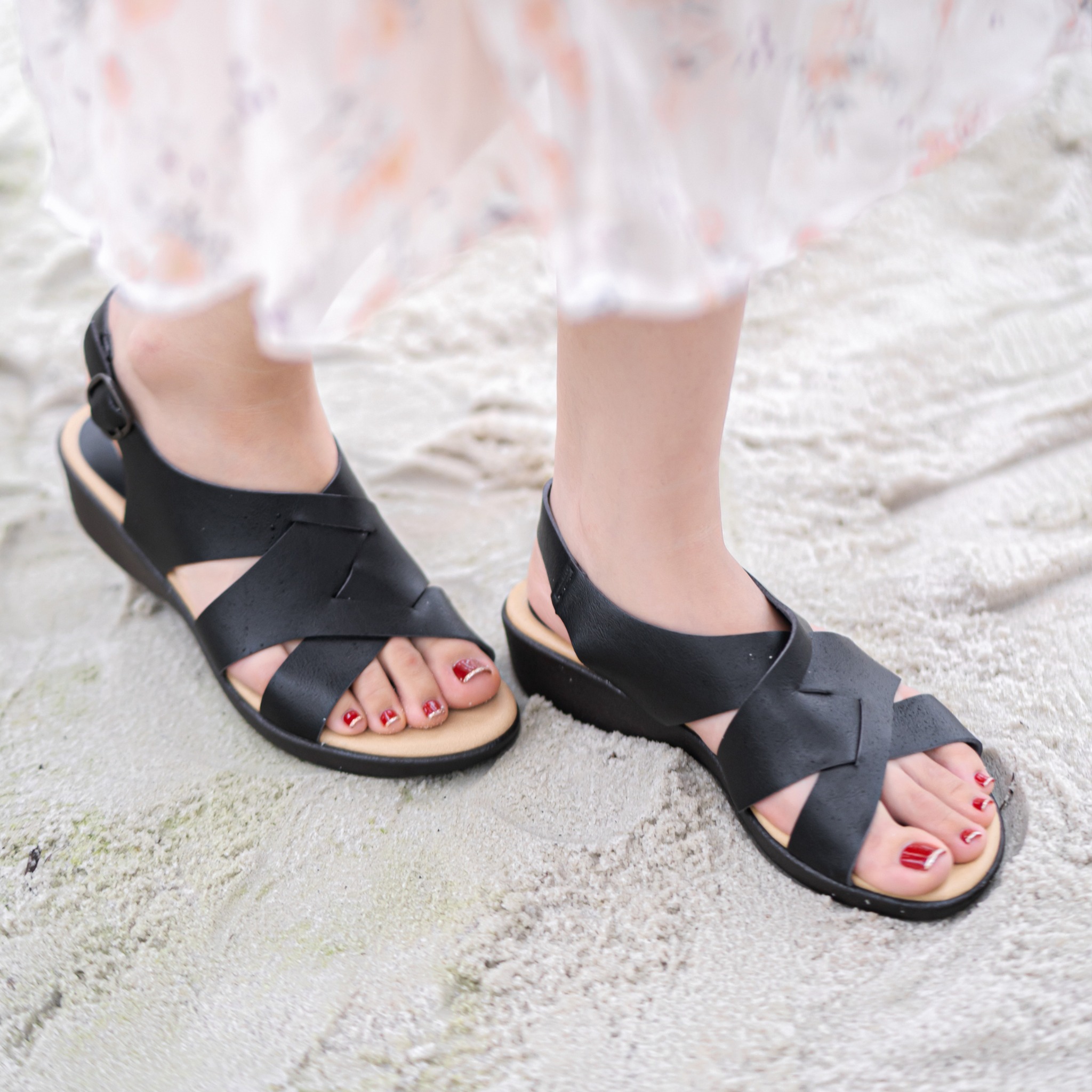- Kiểu dáng: Sandal đế xuồng, quai cài có chun, Sling back